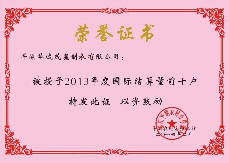 日前,平湖華城茂麓制衣有限公司以突出的業(yè)績(jī),被平湖農(nóng)村合作銀行授予“ 2013年度 國(guó)際結(jié)算量前十戶”稱號(hào)。