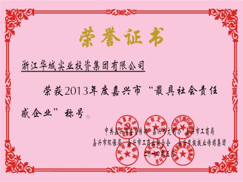 由嘉興市委宣傳部、市文明辦、市工商局、市環(huán)保局、市工商聯(lián)、《嘉興日報(bào)》報(bào)業(yè)傳媒集團(tuán)聯(lián)合主辦,《南湖晚報(bào)》承辦的嘉興市首屆“最具社會(huì)責(zé)任感企業(yè)(家)”評選活動(dòng),日前評出結(jié)果,華城集團(tuán)喜獲嘉興市首屆“最具社會(huì)責(zé)任感企業(yè)”稱號。