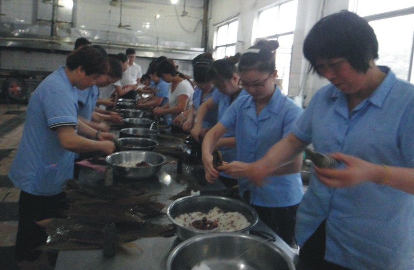 比賽現(xiàn)場氣氛熱烈,參加比賽的選手來自華城制衣各生產(chǎn)車間,清一色都是巾幗女將,雖然年齡參差不齊,卻個(gè)個(gè)都是精神氣爽。她們懷著熱情而來,信心滿滿,活力充沛,因?yàn)殡S著企業(yè)文化的深入人心,隨著一次次企業(yè)活動的順利開展,大家都喜歡上了參加企業(yè)組織的各種活動,都明確一個(gè)觀點(diǎn):參加企業(yè)活動,不問結(jié)果,重在參與。參賽選手中不乏包粽子的能手,比賽一開始,但見她們雙手靈活轉(zhuǎn)動,粽葉在手中優(yōu)美旋轉(zhuǎn),一個(gè)個(gè)棱角分明的粽子一會就已成形;也有一些選手雖然包過但動作不熟練,甚至還有選手是第一次包粽子,可想這水平處于劣勢。雖然她們技術(shù)不精,但是勇于參加活動的精神可嘉,比賽現(xiàn)場成了她們學(xué)習(xí)包粽子的培訓(xùn)速成班,學(xué)得很是認(rèn)真,每一個(gè)動作都在能手們的指點(diǎn)下按部就班,心不慌,手不亂,一絲不茍,粽子也越包越漂亮。