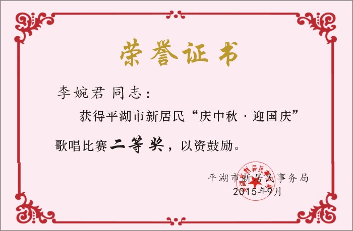 為活躍節(jié)日氣氛,豐富新居民精神文化生活, 9月20日下午,平湖市新居民事務(wù)局在平湖市文化館組織開展了新居民“慶中秋·迎國慶”歌唱比賽,我集團(tuán)公司下屬華城衣歌路員工李婉君榮獲了本次歌唱比賽二等獎(jiǎng),充分展現(xiàn)了我公司新居民員工良好的精神風(fēng)貌和藝術(shù)素養(yǎng)。
