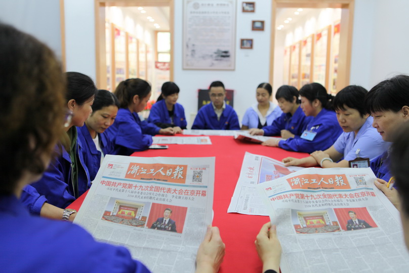 通過(guò)企業(yè)廣播,全廠每個(gè)員工都在學(xué)習(xí)十九大報(bào)告,領(lǐng)悟十九大精神。