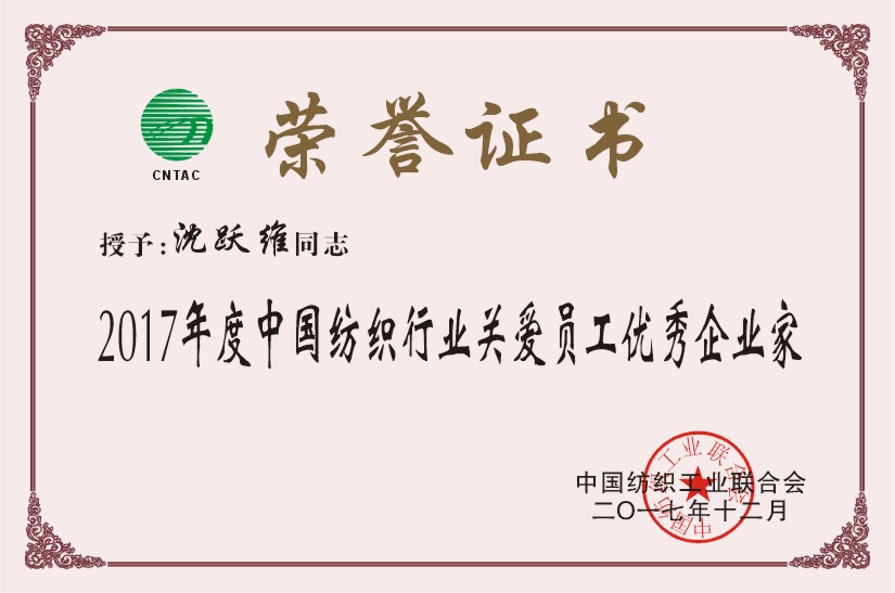 中國紡織工業(yè)聯合會是全國性的紡織行業(yè)聯合會,是新時期中國紡織工業(yè)有序發(fā)展和與時俱進的綜合協調與服務機構,有中國服裝協會、中國針織工業(yè)協會、中國棉紡織行業(yè)協會等幾十家行業(yè)協會成員單位。此次,沈總榮獲“中國紡織行業(yè)關愛員工優(yōu)秀企業(yè)家”稱號是平湖唯一一個獲得這個獎項的企業(yè)家。