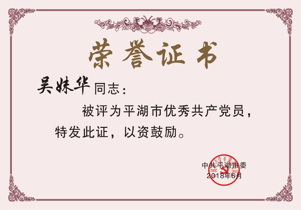 “平湖市優(yōu)秀共產(chǎn)黨員”獲得者吳妹華獲獎后感言:感謝各級領(lǐng)導(dǎo)和同事們對我們的信任和工作的肯定,面對“優(yōu)秀共產(chǎn)黨員”的殊榮,我深深地感受到了同事們對我工作的鼓勵、支持與期待,成績不是終點(diǎn),而是全新的起點(diǎn)。今后,我會把“優(yōu)秀黨員”這個榮譽(yù)看作是對自己的鼓勵和鞭策,在工作崗位上一如既往,繼續(xù)努力。