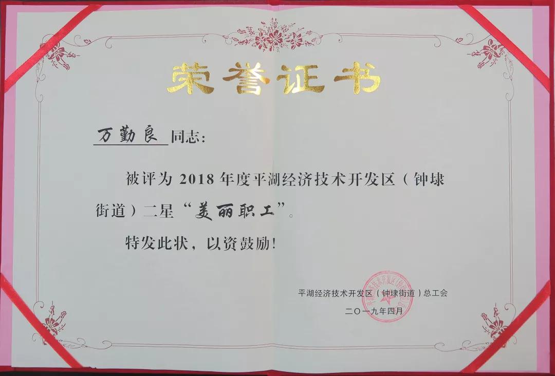 華城衣歌員萬勤良榮獲在平湖經(jīng)濟(jì)技術(shù)開發(fā)區(qū)“星級三美”爭創(chuàng)活動中被評為二星“美麗職工”稱號。