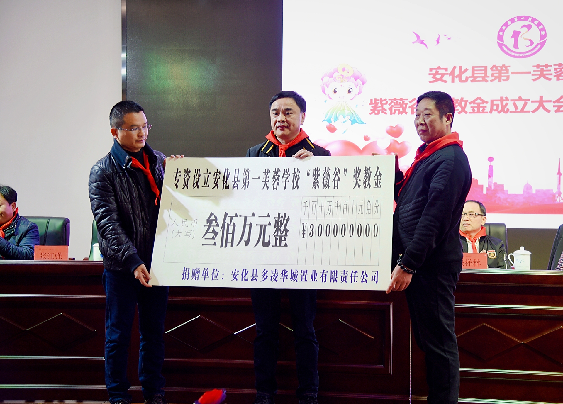 為了把學(xué)校辦成政府滿意、社會滿意、家長滿意的一流學(xué)校,有效推進安化縣教育事業(yè)的發(fā)展,進一步弘揚尊師重教的良好風(fēng)尚,形成全社會共同關(guān)心、支持教育事業(yè)的良好氛圍。同時努力改善第一芙蓉學(xué)校辦學(xué)條件、提升辦學(xué)質(zhì)量,鼓勵教育教學(xué)成績突出的優(yōu)秀教師更加勤奮工作,鼓勵品學(xué)兼優(yōu)的在讀學(xué)生勤奮學(xué)習(xí),并兼顧資助貧困山區(qū)的建檔立卡優(yōu)秀學(xué)生完成學(xué)業(yè),為國家培養(yǎng)更多的優(yōu)秀人才,力爭把芙蓉學(xué)校辦成安化縣內(nèi)最好、益陽市內(nèi)一流的學(xué)校,安化縣多凌華城置業(yè)有限責(zé)任公司通過縣慈善總會捐贈300萬元、設(shè)立“安化縣第一芙蓉學(xué)校紫薇谷獎教金”。通過獎勵、資助,提高學(xué)校教育教學(xué)水平,激發(fā)學(xué)生努力學(xué)習(xí),推動第一芙蓉學(xué)校教育教學(xué)蓬勃發(fā)展。