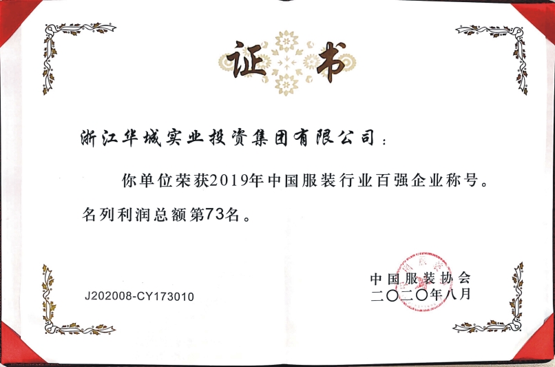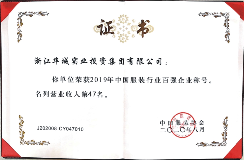 2020年8月,中國服裝協(xié)會(huì)正式發(fā)布“2019年服裝行業(yè)百強(qiáng)企業(yè)”名單。我集團(tuán)公司以“營業(yè)收入第47名” “利潤總額第73名”“營業(yè)收入利潤率第95名”再次榮登中國服裝行業(yè)百強(qiáng)企業(yè)行列,這已是我公司第15次獲此殊榮。