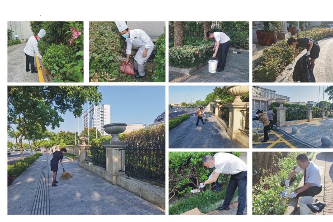 9月5日上午,酒店組織中高層管理人員及員工30多人,對(duì)酒店外圍環(huán)境及停車場(chǎng)環(huán)境進(jìn)行衛(wèi)生大整治。