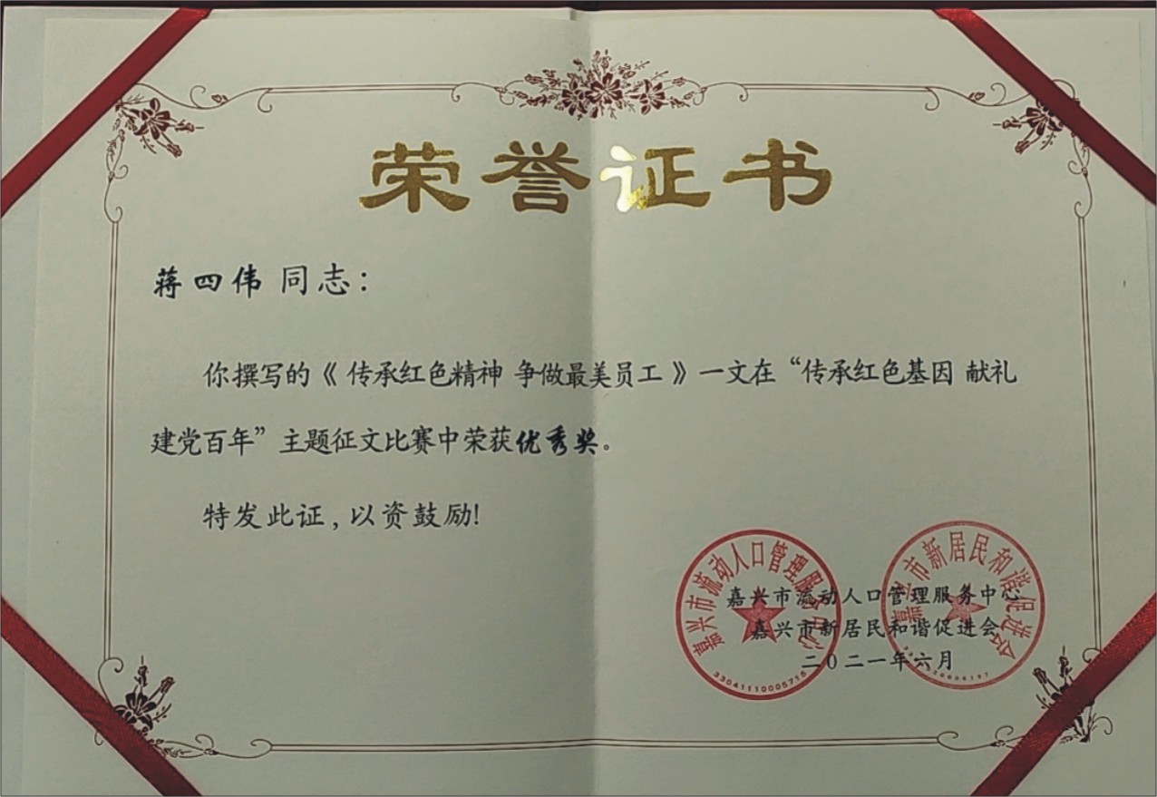 在建黨百年到來之際,嘉興市流動人口管理服務(wù)中心及嘉興市新居民和諧促進(jìn)會組織舉辦了“傳承紅色基因•獻(xiàn)禮建黨百年”主題征文比賽。我公司員工蔣四偉以《傳承紅色精神•爭做最美員工》一文獲得征文比賽優(yōu)秀獎。此次嘉興市征文比賽,平湖僅有2人獲獎,足以證明這個獎項具有一定的含金量。