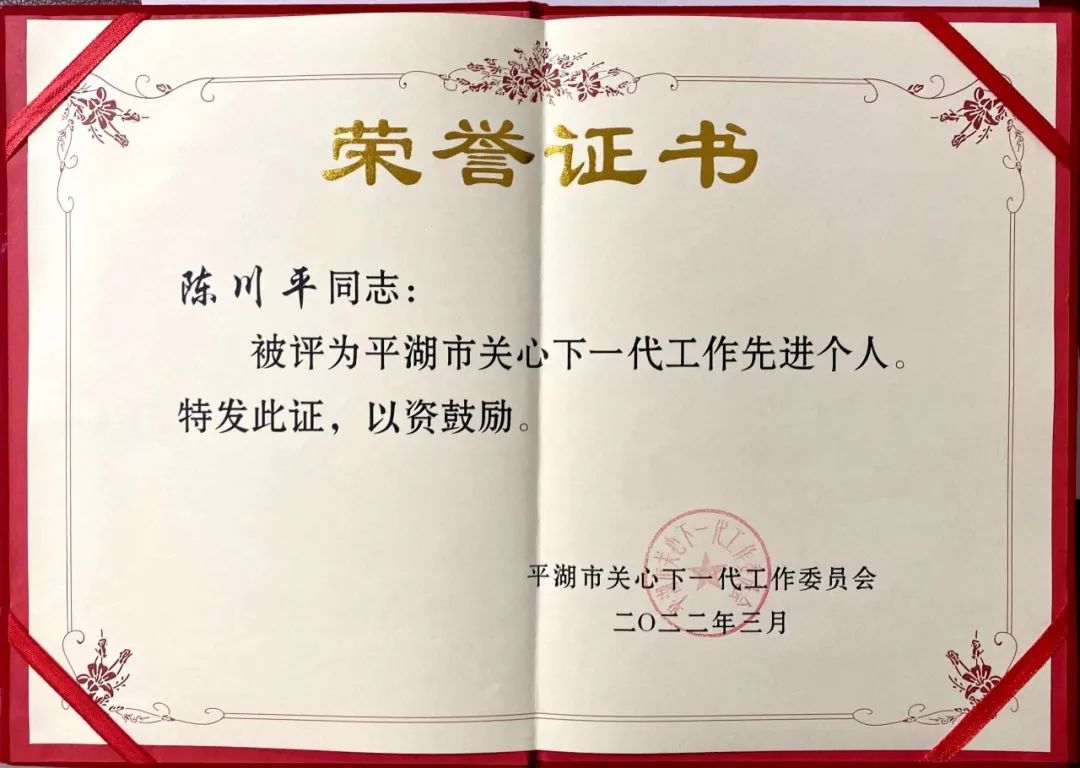 我公司黨委書記、關(guān)工委主任陳川平榮獲“平湖市關(guān)心下一代工作先進(jìn)個(gè)人”稱號(hào),是平湖經(jīng)開區(qū)企業(yè)中唯一獲此榮譽(yù)的“關(guān)工人”。