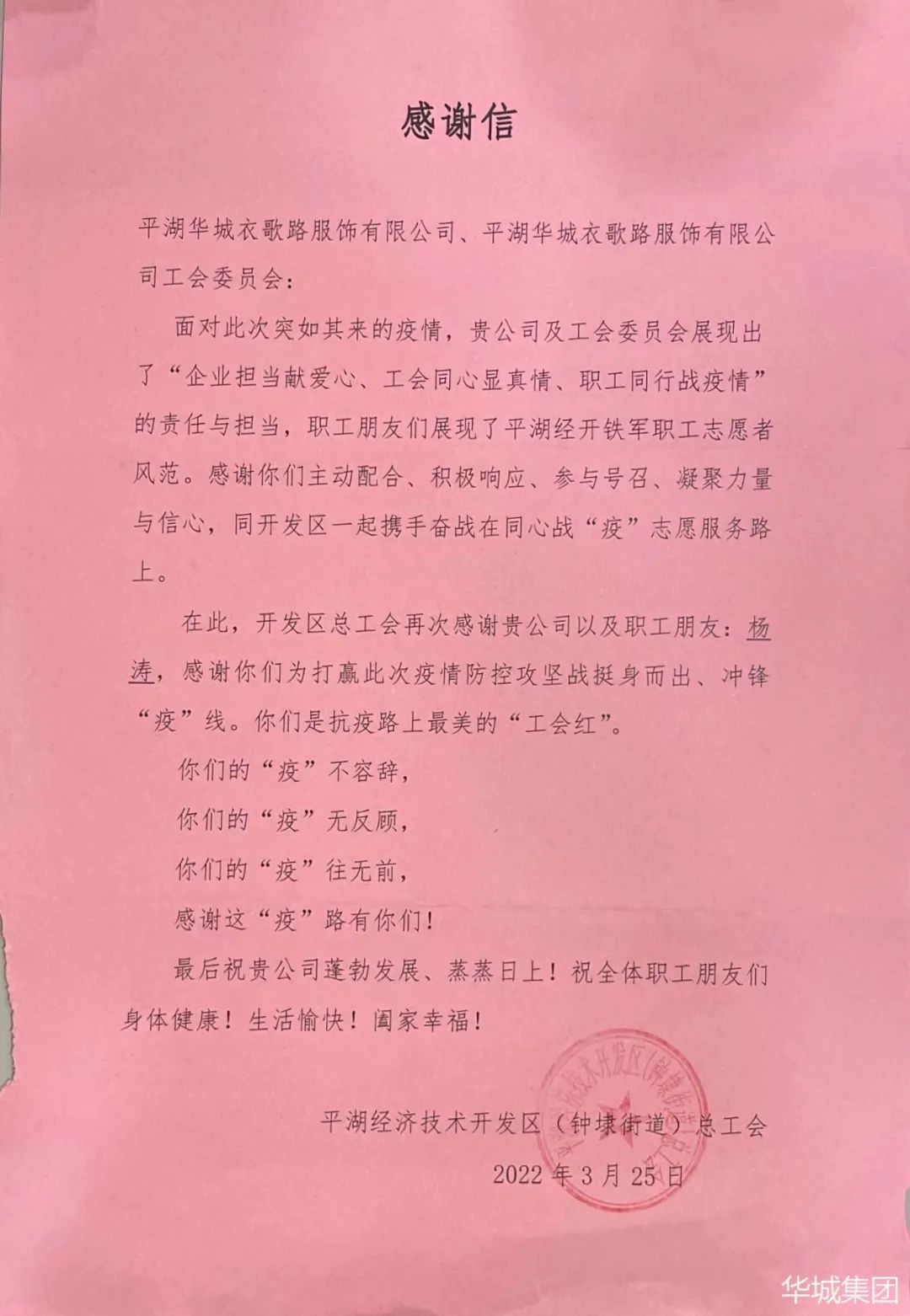 當(dāng)前位置:首頁 > 華城動態(tài)日前,一封來自平湖經(jīng)濟(jì)技術(shù)開發(fā)區(qū)(鐘埭街道)總工會的感謝信,被送到了華城衣歌路。