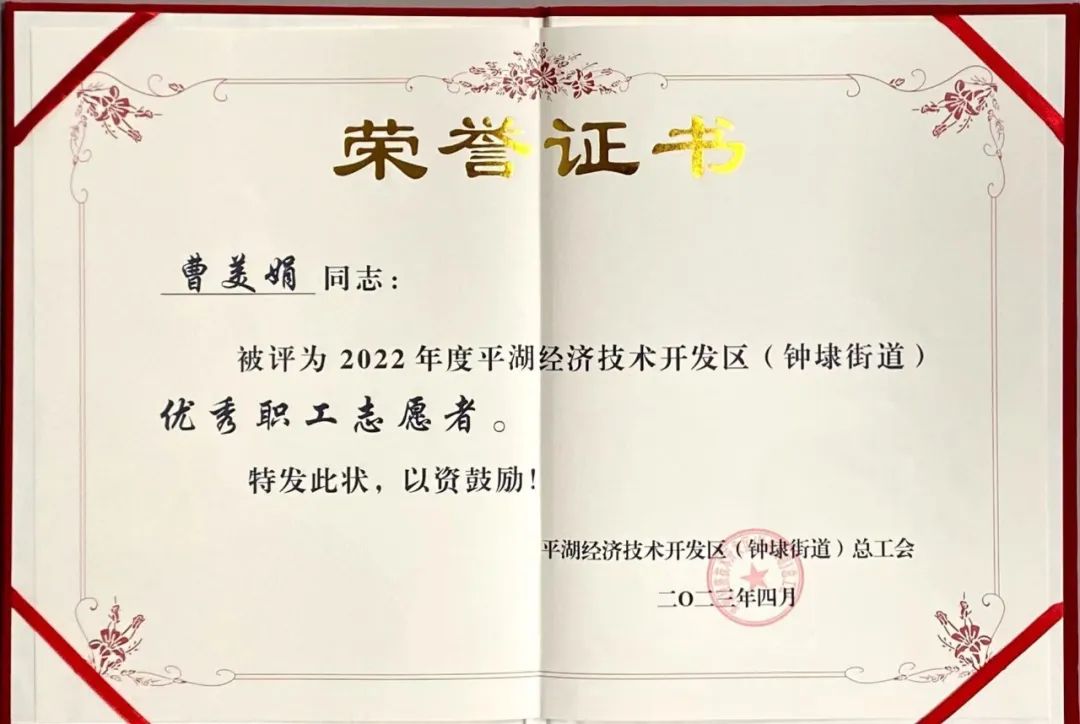 平湖華城茂麓制衣有限公司員工曹美娟榮獲“2022年度平湖經(jīng)濟技術(shù)開發(fā)區(qū)(鐘埭街道)優(yōu)秀職工志愿者”稱號;