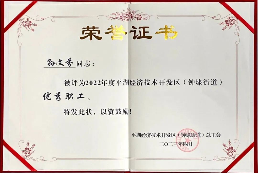 平湖市華城制衣股份有限公司員工孫文芬榮獲“2022年度平湖經(jīng)濟技術(shù)開發(fā)區(qū)(鐘埭街道)優(yōu)秀職工”稱號;