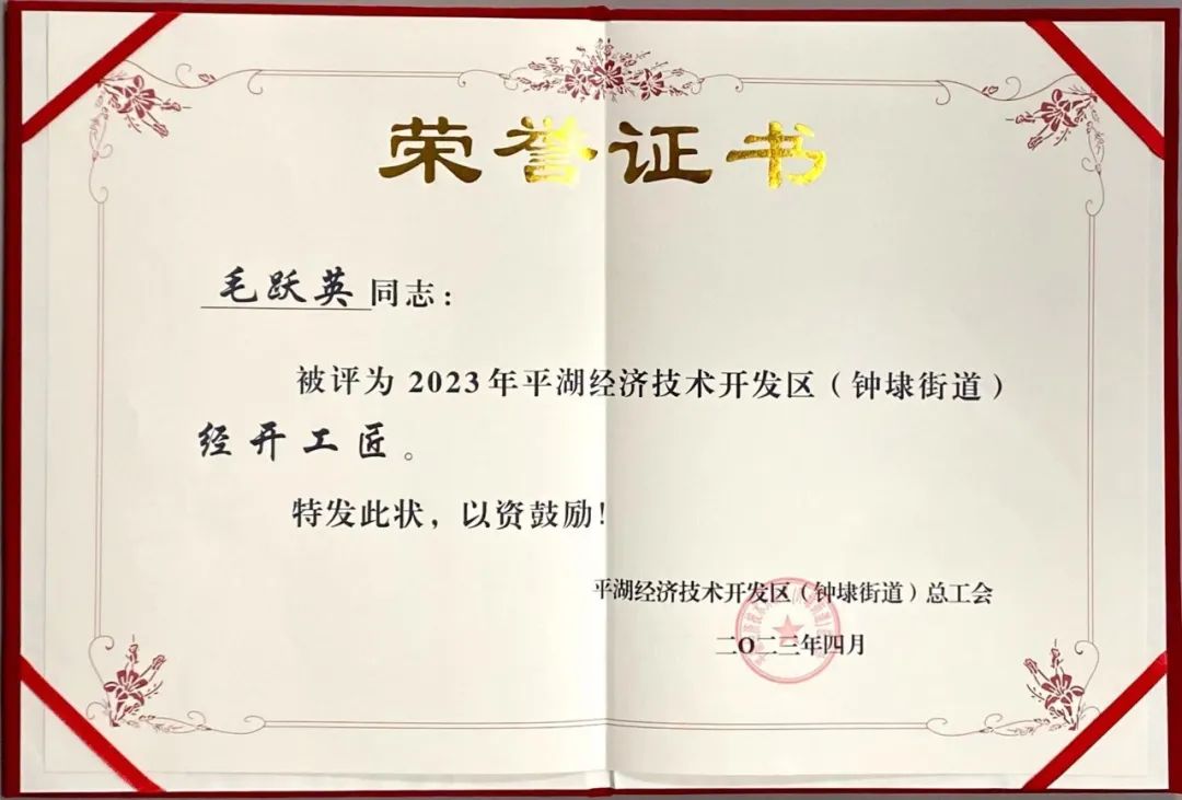 平湖華城茂麓制衣有限公司員工毛躍英榮獲“2023年平湖經(jīng)濟技術(shù)開發(fā)區(qū)(鐘埭街道)經(jīng)開工匠”稱號。