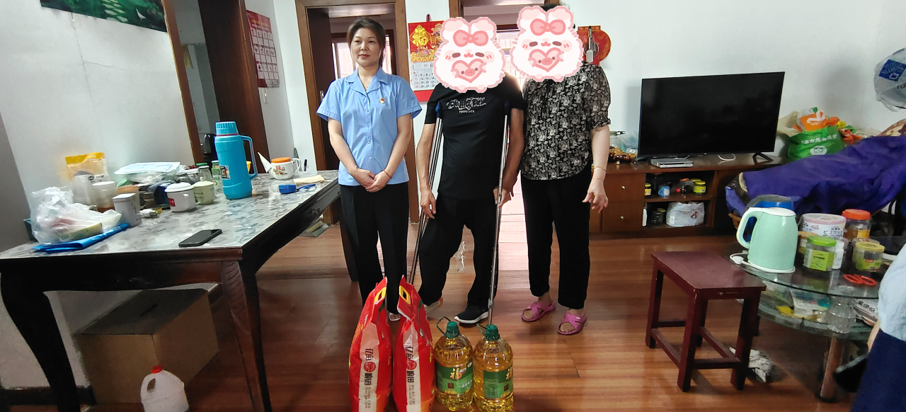 最后一站,西林寺東區(qū)孤老熊女士家里。熊女士丈夫今年去世,領(lǐng)養(yǎng)的兒子是殘疾人,是社區(qū)比較關(guān)注的特殊群體之一。當(dāng)看到社區(qū)和企業(yè)送上門來的油和米,熊女士非常感動,這也極大地增加了她對生活的樂觀心情。